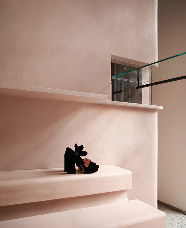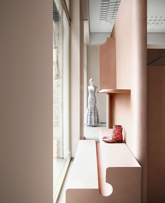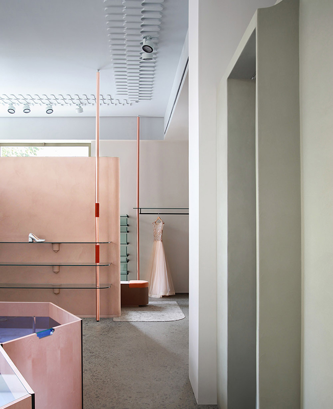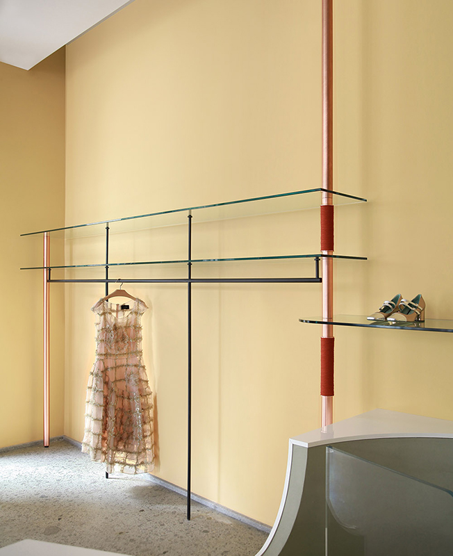 Он также становится выставочным дисплеем, на котором можно разместить обувь, сумки и аксессуары, и фоном для селфи. Другой архитектурный элемент вмещает раздевалки. Горизонтальный характер выставочных витрин компенсируется вертикалями медных опор, украшенных текстильными накладками (Kvadrat).