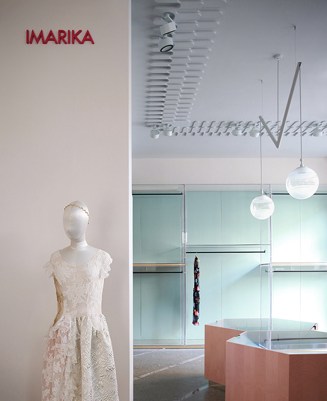 Андреа Марканте и Аделаида Теста, Marcante-Testa, отремонтировали и расширили бутик Imarika, известной сети миланских мультибрендовых магазинов женской одежды. Итальянские архитекторы использовали свой фирменный подход: в интерьере присутствует микс необычных материалов с интересными цветами и продуманными деталями. Магазин площадью 180 кв. метров разделен угловым деревянным экраном-перегородкой, покрытым штукатуркой. Он также становится выставочным дисплеем, на котором можно разместить обувь, сумки и аксессуары, и фоном для селфи. Другой архитектурный элемент вмещает раздевалки. Горизонтальный характер выставочных витрин компенсируется вертикалями медных опор, украшенных текстильными накладками (Kvadrat). Опоры поддерживают подвесные рельсы, направляя взгляд к декоративному потолку. Верхний свет помогает превратить потолок в перевернутый ковер. Система шкафов из акрилового плексигласа и светильники изготовлены по индивидуальным размерам.