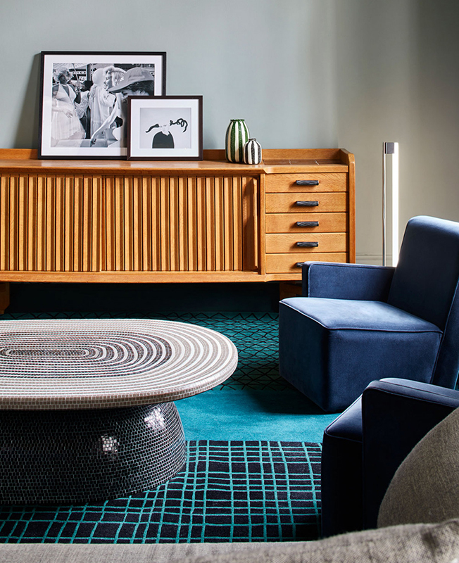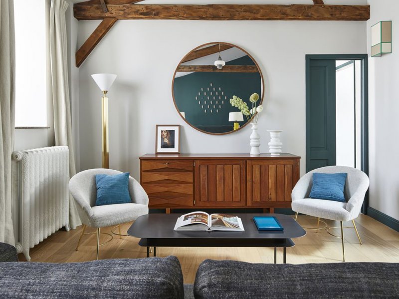 Выбор предмета основан на ассортименте собственного бренда Maison Sarah Lavoine и галерейных вещах, которые она присмотрела у Nilufar, Riviera и Kreo. Например, для украшения гостиной декоратор выбрала низкий мозаичный стол Пьера Шарпена, Galerie Kreo. Конечно, здесь есть и современный итальянский дизайн от таких топовых брендов как Cassina и Moteni&C перед «бархатными» римейками Джо Понти не устоит сегодня ни один модный профи, даже Сара).
