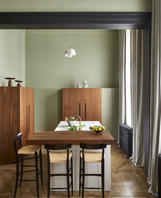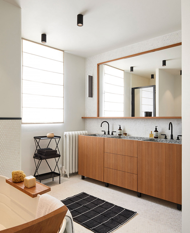 Сара Лавуан выбирала материалы с большой строгостью и деликатностью, сочетая мрамор с грецким орехом и дубом, латунью с раттаном. «Все было разработано, чтобы удовлетворить потребности клиента и максимально эффектно использовать естественный свет».