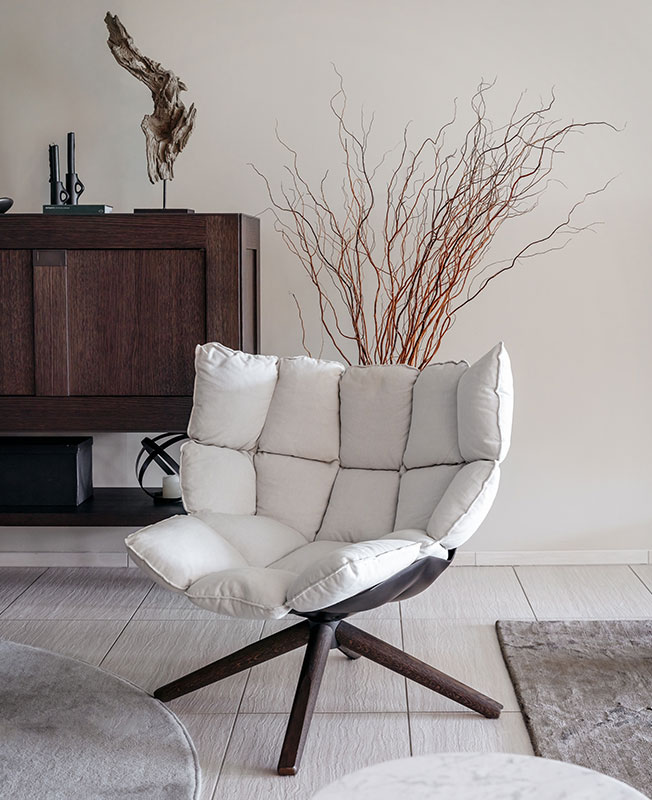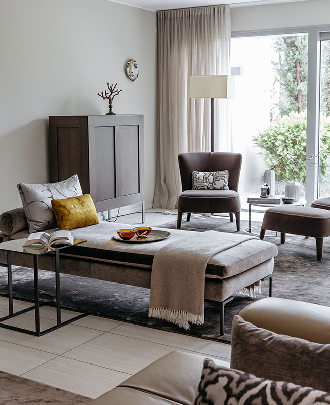 Среди несомненных достоинств квартиры — близость к пруду и живописные виды. К недостаткам можно отнести неудачное расположение в интерьере колонны квадратного сечения. Чтобы ее замаскировать, возвели двусторонний камин, сформировав лаундж-зону с кушеткой, двумя креслами и оттоманкой. Мария рассказывает, что вместе с хозяйкой квартиры они шутливо прозвали эту зону «курилкой», представляя беседы мужской компании за сигарой. «Забавно то, что в этой семье никто не курит», — отмечает архитектор.