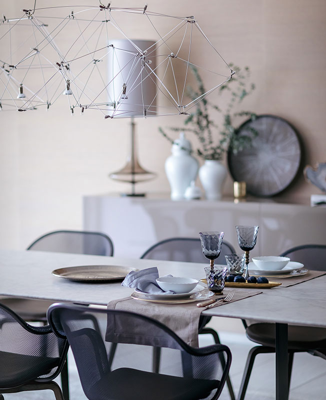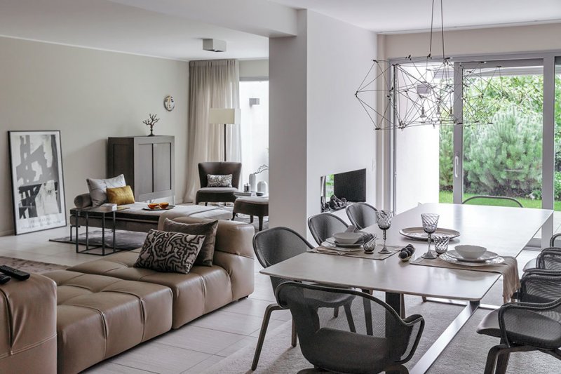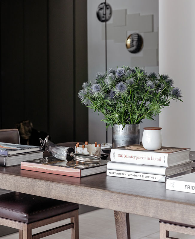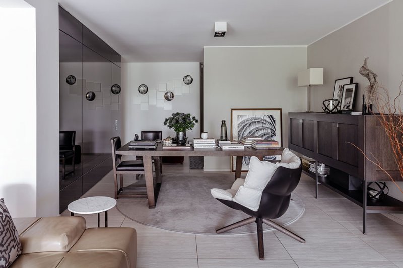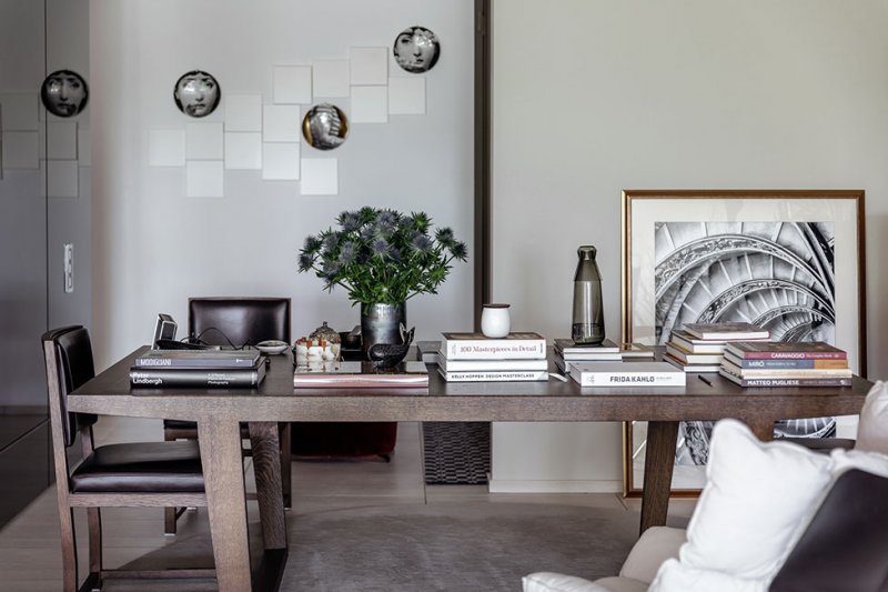 Дубовый обеденный стол от Maxalto также перебрался из прежней квартиры. Он не отвечал пропорциям нового пространства, поэтому его решили использовать нетипичным образом. «В доме теперь два обеденных стола, один из которых стал библиотекой и встречает хозяев и гостей раскладкой фотоальбомов, интерьерных авторских книг и курьезными предметами декора». Старые и новые предметы объединяет спокойная природная палитра. Фактуры добавляет отделка и аксессуары: древесина пепельного дуба, обои из сизали, гладкие ковры из растительного шелка.