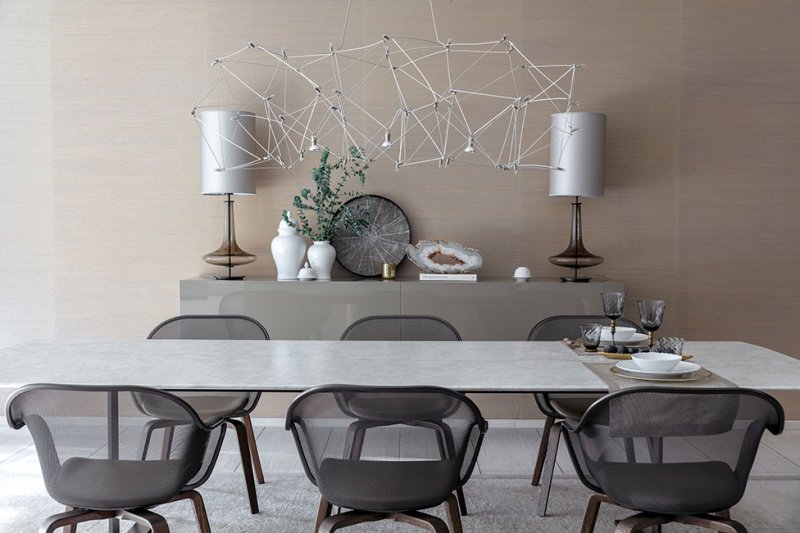 Часть мебели перевезли из старой небольшой квартиры, например, кожаный диван карамельного цвета. Он легко вписался в новый интерьер за счет измененной конфигурации: пуф, который использовался отдельно, стал частью дивана, увеличив количество посадочных мест. «Выбор стульев в столовой оказался делом непростым, и к моему удивлению хозяйка сама предложила нетривиальный вариант из металлической сетки, с подлокотниками и кожаным сиденьем». По мнению архитектора, особенно гармонично модели смотрятся на фоне сизалевого настенного покрытия.
