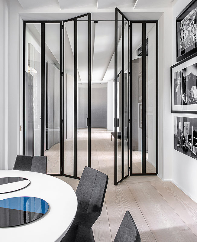 Складные двери с заполнением из прозрачного стекла бренда Pouenat — условная граница между помещениями. Черный стальной профиль — выразительный графичный акцент. На столе сервировочные тарелки, диз. Индиа Мадави.