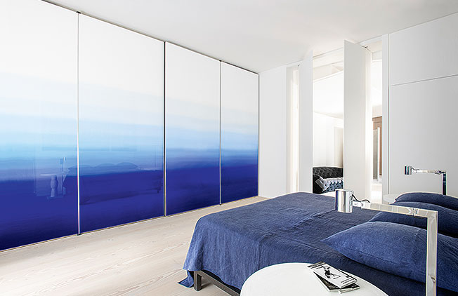 Раздвижные двери шкафа выполнены из стекла и расписаны художниками Reeze Studio: синяя абстракция выглядит как морской пейзаж. Льняное покрывало Ravel. На полу, как и во всем доме, выбеленная доска из массива пинии с подчеркнутой текстурой.