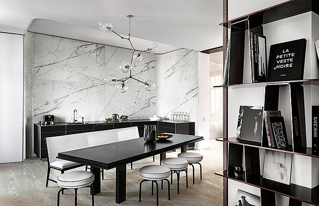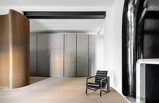 «Я хотел вытащить эту декорацию из прошлого и превратить ее в нечто мощное — модное и тем не менее вневременное. Для этого пришлось до основания оголить пространство, сфокусировавшись на деталях, которые больше имеют отношение скорее к архитектуре, чем к интерьерному дизайну». Так возник этот красивый, убедительный интерьер, лаконичный, но не стерильный и, несмотря на почти полное отсутствие цвета, — очень яркий.