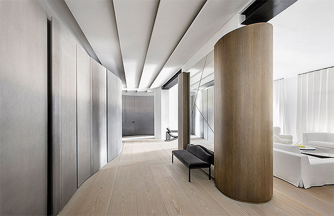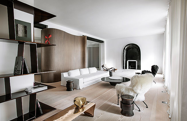 Длинный темный коридор автор раскрыл в жилые комнаты, создав светлое современное пространство. Скамья из бронзы и бархата, Christian Liaigre. Асимметрия и органические линии вносят в интерьер живость.