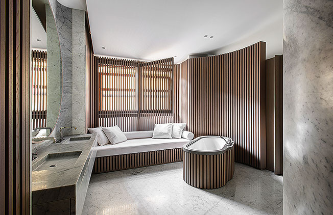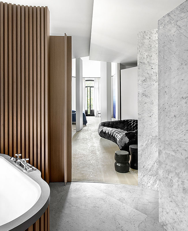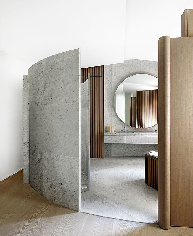 Плавные скругленные линии в значительной степени определяют образ проекта. Технологическая удача — изогнутые перегородки из массива каррарского мрамора. Классический дуэт камня и дерева Ф. Шампсор заставил звучать по-новому.