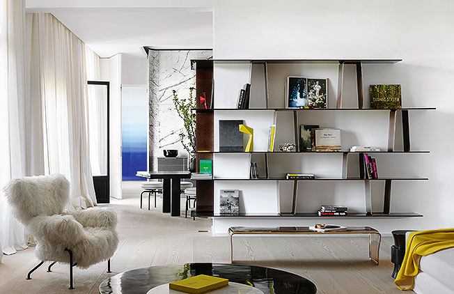Комнаты образуют анфиладу: в глубине видна спальня. Слева кресло Tre Pezzi, диз. Ф. Альбини, Cassina (лимитированная серия в обивке из шкуры монгольской козы). Стеллаж, диз. Ф. Шампсор для Pouenat.