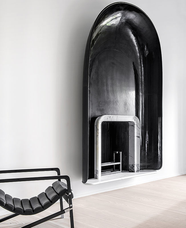 Бронзовый камин спроектировал Э. Шмитт. Кресло Transat, классика дизайна от Э. Грей (1929), нечасто встречается в современных интерьерах.