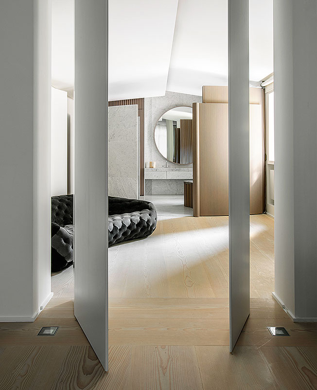 Чтобы избавить интерьер от буржуазного духа, фальшпотолки, появившиеся в 1970-х, были удалены, паркет заменен 6-метровой сосновой доской, установлены 3-метровые раздвижные и поворотные двери. Скругленные поверхности подчеркивают текучесть, чувственность и органичность интерьера. Например, душевая кабина расположена между двумя дугообразными перегородками из мрамора. По вечерам комнаты подсвечены встроенными в пол лампами: лучи отраженного света касаются поверхностей, подобно свечам.