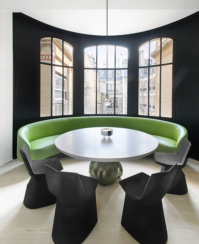 Диван в обивке из зеленой кожи Ф. Шампсор спроектировал по меркам помещения, вписав его в эркер. Стол, из бронзы и кориана, диз. Э. Шмитт. Стулья, диз. К. Грчич, ClassiCon. Черный цвет подчеркивает красивую форму окон. Люстра, диз. Э. Бергер.