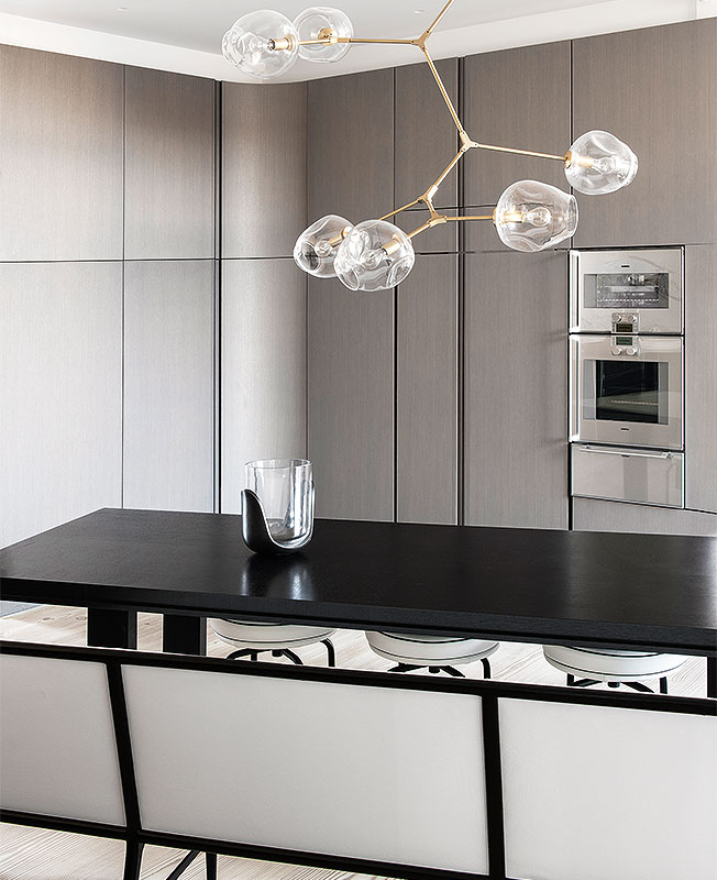 Кухня изготовлена на заказ по дизайну Ф. Шампсора. Гладкие фасады скрывают «бытовые» подробности. Люстра из латуни и хрустального стекла — гламурный акцент.