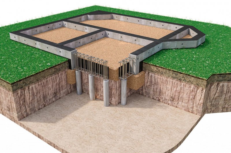 Этот тип характеризуется наличием полосы железобетона по всему периметру, а также вертикальными сваями. Он отлично подходит для грунта, имеющего отклонения от горизонта на 2-5 градусов.