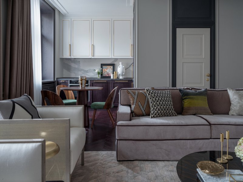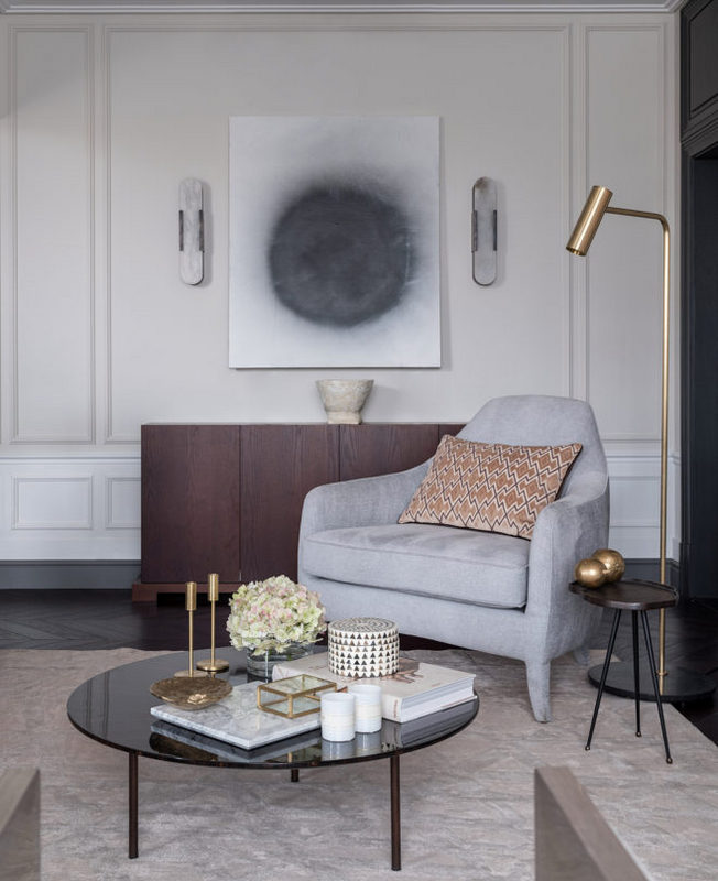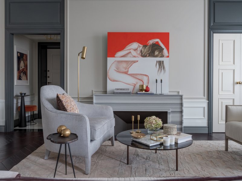 Фрагмент гостиной. Напольный светильник слева Heron, CTO Lighting, Booroom Gallery. Напольный светильник справа Frankfort, Aerin Lauder, Visual Comfort Gallery. Дизайнер Сергей Храбровский создал для молодой девушки спокойный интерьер, ставший гармоничным фоном для предметов современного искусства. Квартира площадью 64 кв. метра расположена на Кутузовском проспекте, недалеко от Триумфальных ворот. Квартира в старом жилом фонде без шуток напоминала декорации к фильму ужасов. Дизайнер принял решение сносить и демонтировать все перегородки (кроме санузла) и начинать проектировать интерьер с чистого листа. До перепланировки в квартире был узкий коридор, который минимизировали до прихожей, отдельная библиотека, ставшая гардеробной и изолированная кухня, которую объединили с гостиной. Гостиная. Камин из натурального мрамора выполнен по эскизам дизайнера. Ковер, Jerome Botanic. Гостиная. Люстра Halo Medium, Barbara Barry, Visual Comfort Gallery. Лепнина на стене, Orac Decor, «Ампир Декор». Диван James Sofa Bed, Meridiani, Deluxe Interiors. Подушки, Pierre Frey, Kirkby, Harlequin, «Мастерская Матильды Скамейкиной». Заказчица, молодая девушка, сама по себе спокойный и рассудительный человек, поэтому пожелания были достаточно понятными — темный пол, лепнина на стенах, современная мебель. Кухня. Гарнитур выполнен по эскизам дизайнера, мастерская Any-Home. Стол, «Арт-Лес». Стулья винтаж, текстиль Tinto, Zimmer Rohde. «Основным стимулом было уйти от «русской» вычурности в интерьере. Возможно, в какой-то степени на подсознательном уровне свою лепту внесла эстетика Триумфальных ворот на Кутузовском, расположенных рядом с домом. По сути интерьер создан по моим внутренним впечатлениям от заказчицы — ее манере говорить, одеваться, ее рассказах о любимых местах, хобби», — делится впечатлениями Сергей. Фрагмент гостиной. Кресло Margaret, Munna, Booroom Gallery. Подушка, Jerome Botanic. Комод, «Арт-Лес». Бра Melange Elongated, Kelly Wearstler, Visual Comfort Gallery. Картина «Притяжение», Таня Клят, Repeat Story. «Заказчица была категорически против обоев в любом виде, только покраска. В санузле и прихожей – натуральный мрамор, в гостиной и спальне — паркетная доска французской елкой. На стенах в ванной — керамика АRCH-SKIN. Изначально хозяйка квартиры была решительно настроена в пользу натурального мрамора, но так как сама ванна совсем крошечная, я предложил использовать тонкий керамогранит с рисунком под мрамор, чтобы не «сьедать» пространство толщиной камня». Фрагмент кухни-гостиной. Журнальный столик, La Fibule. Кресло Sintra, Luisa Peixoda Design. Столик у кресла, Ginger