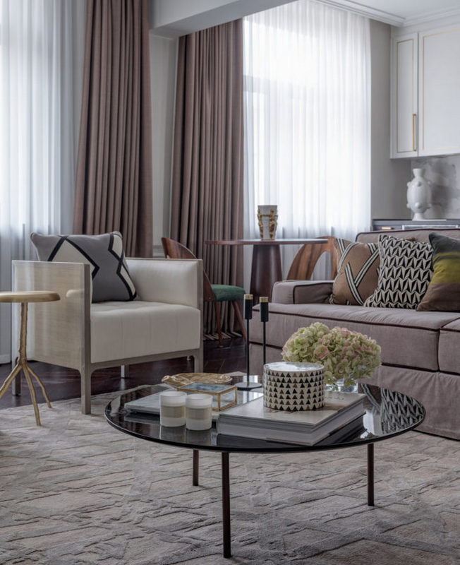 «Основным стимулом было уйти от «русской» вычурности в интерьере. Возможно, в какой-то степени на подсознательном уровне свою лепту внесла эстетика Триумфальных ворот на Кутузовском, расположенных рядом с домом. По сути интерьер создан по моим внутренним впечатлениям от заказчицы — ее манере говорить, одеваться, ее рассказах о любимых местах, хобби», — делится впечатлениями Сергей.