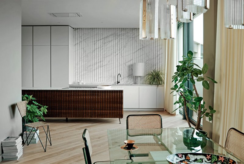 Один из пентхаусов — Helios 710. Девелоперы вдумчиво подошли к выбору авторов, которым могли бы доверить интерьер. Ими стали фэшн-дизайнер Белла Фрейд, известная прежде всего элегантно-лаконичным девичьм трикотажем, и Мария Спик, сооснователь студии Retrouvius, специализирующейся на винтажных предметах обстановки и мебели из утилизованных материалов.