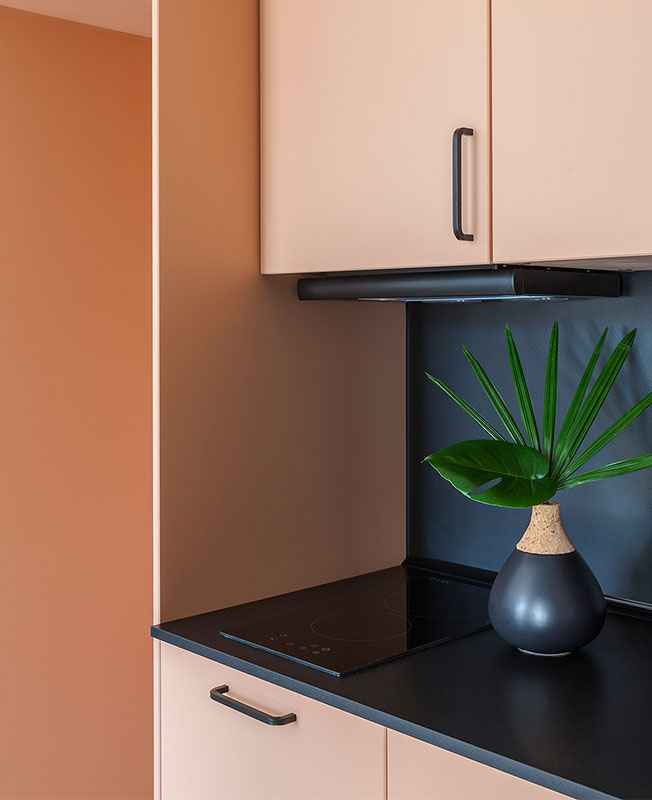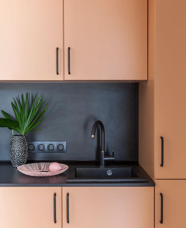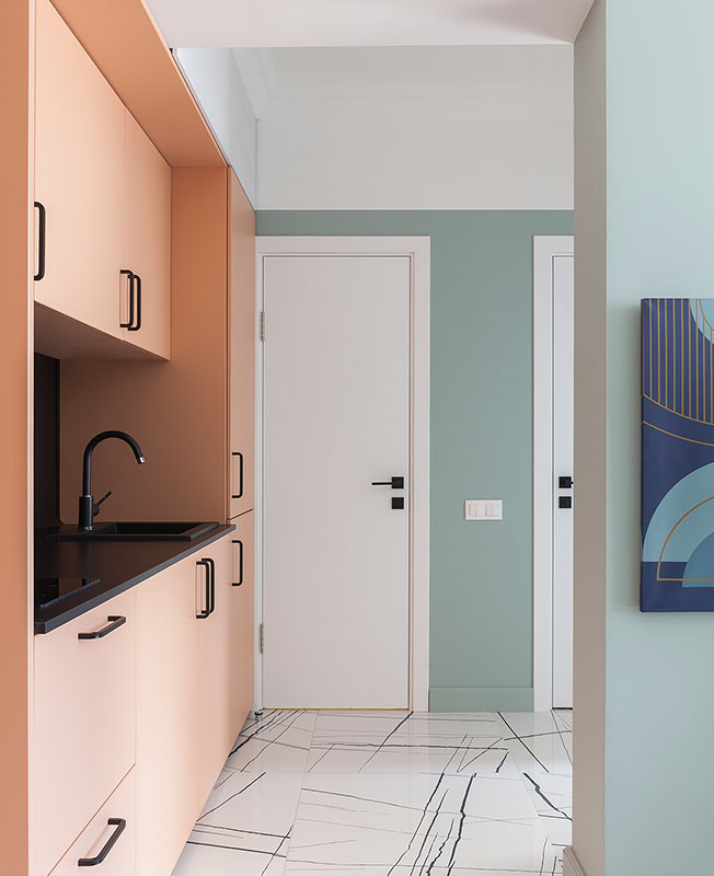 Пространство должно было быть ярким, запоминающимся, интересным, при этом вмещающим максимальное количество спальных мест. Для этого гостиную объединили с прихожей и перенесли в эту зону кухню. Тем более, что квартира для сдачи не подразумевает большого пространства для готовки. Гарнитур максимально замаскировали: с одной стороны прихожей расположен небольшой гардероб, а справа — компактная кухня. Вся группа, включая и входную дверь, выкрашена в нежный коралловый оттенок.