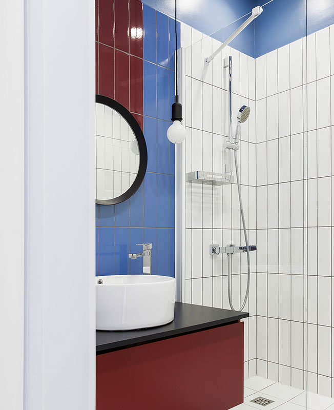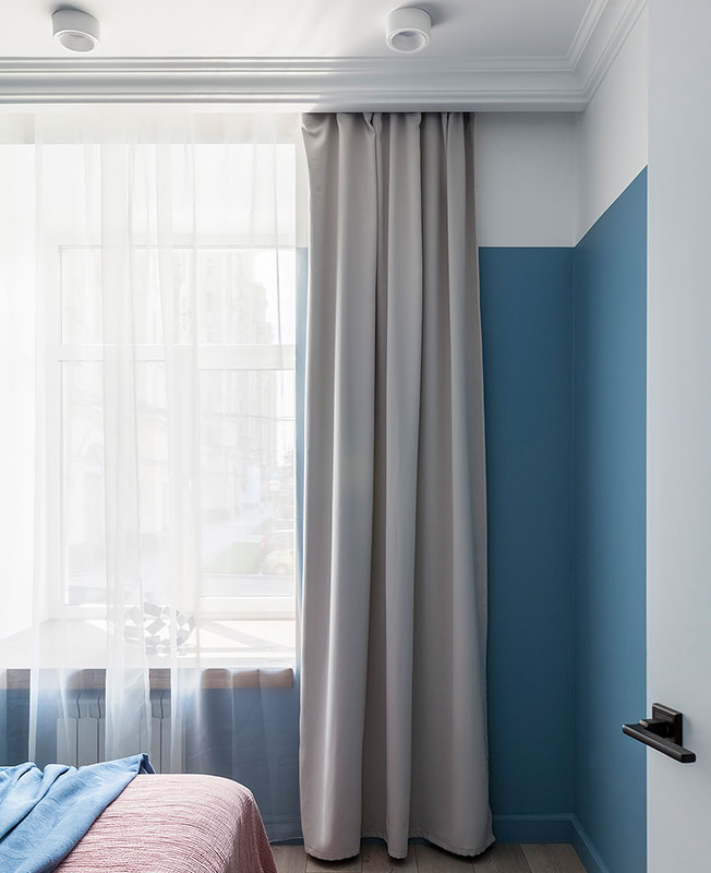 Комнаты получились очень компактными. Чтобы избежать эффект колодца в помещениях с трехметровыми потолками, верх стен оформили широкой белой полосой, которая также ссылается на советское прошлое.