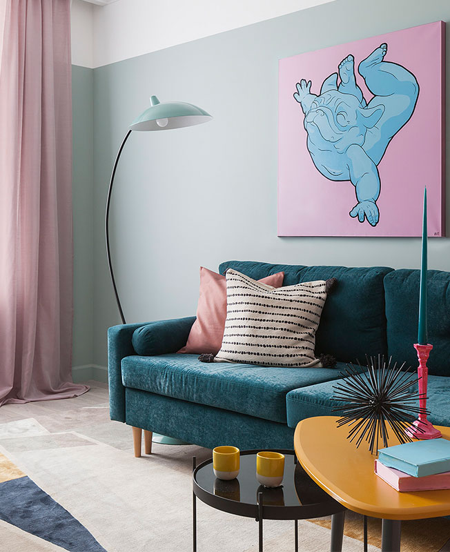 Палитра включает исключительно пыльные оттенки: розовый и голубой в спальнях. Для гостиной выбрали полынь, которая обычно ассоциируется у наших соотечественников с больницей или подъездом. Мебель подбирали, исходя из бюджета: дизайнер сосредоточилась на ярких и доступных предметах обстановки.