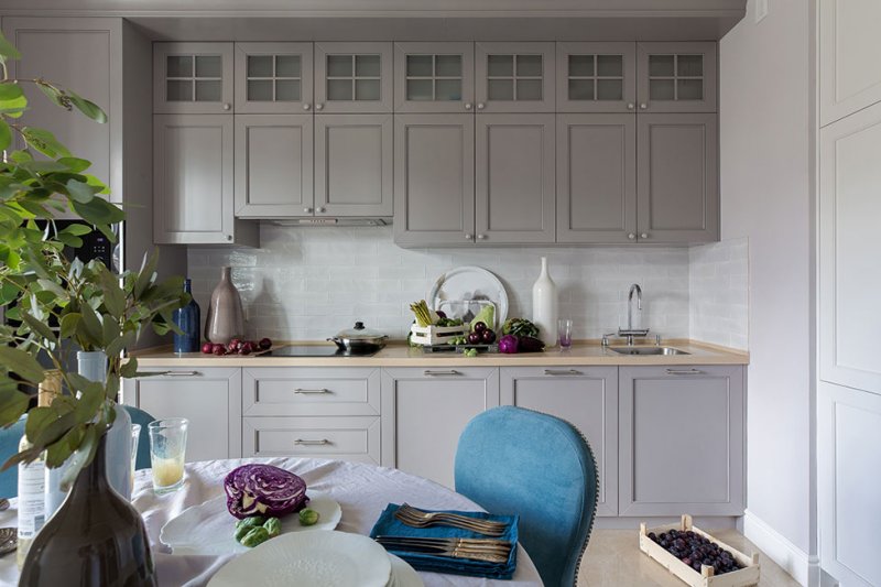 «Владельцы хотели как можно больше места для хранения вещей. Для этого на кухне навесили ряд шкафов под самый потолок. Но чтобы мебель не воспринималась громоздко, вместо глухих фасадов использовали застекленные с подсветкой. Так в вечернее время за ужином создается особая романтичная атмосфера».