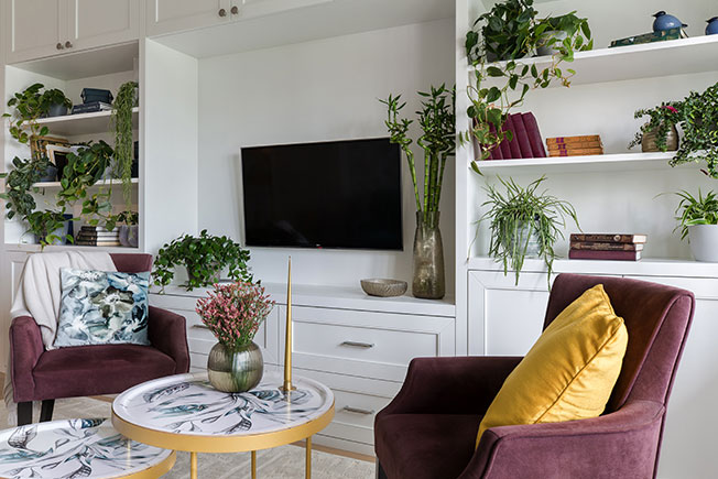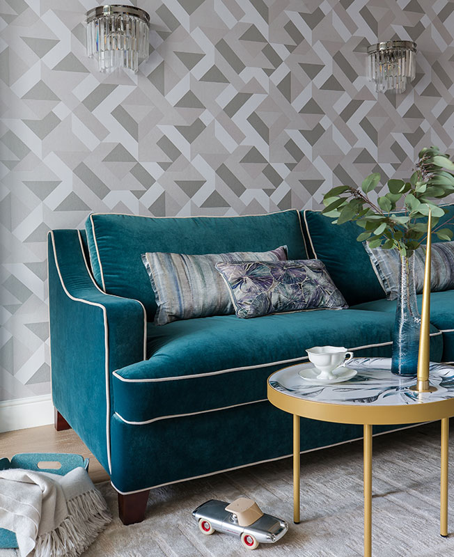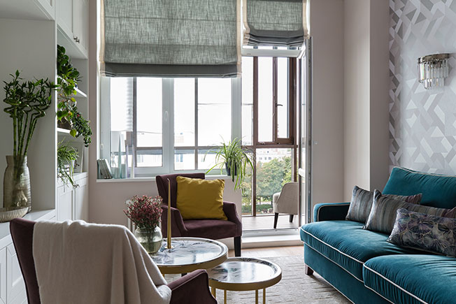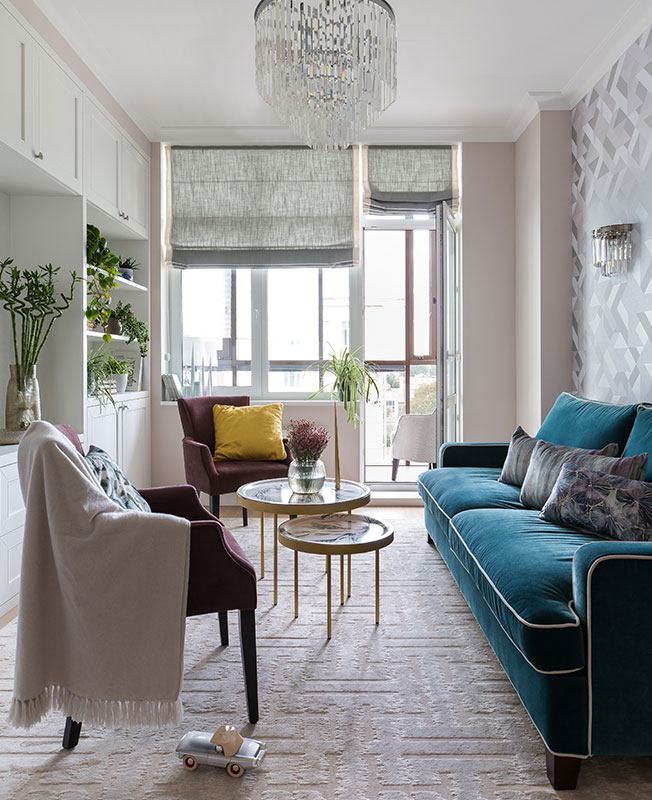 «Бюджет был несколько ограничен, по этой причине мебель подбиралась тщательно и неспешно. Заказчице особенно понравился диван с обивкой бирюзового цвета, который и задал тон в последующем подборе предметов обстановки. С помощью лепнины интерьеру добавили немного истории».