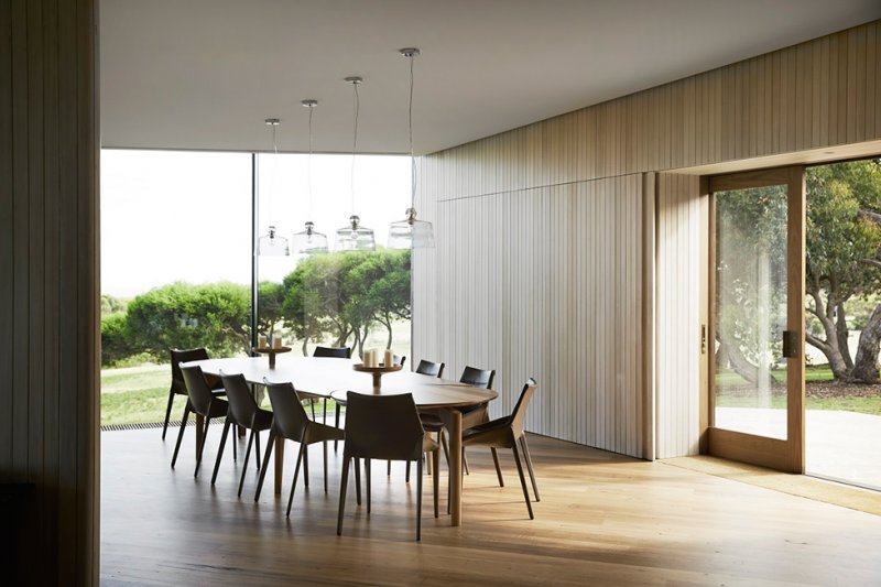 Главная точка, от которой строится планировка Boneo Country House — это кухня. Здесь есть массивный очаг (плита Aga) и системы стеллажей из латуни. Узорные плитки ручной работы были выбраны архитекторами, которым важно было подчеркнуть technocraft и показать живые следы ручного труда. «Вы обнаружите, что стены различаются по толщине, до метра в глубину, чтобы вместить предметы», — говорит Джон, который сотрудничал с дизайнером Эндрю Лоу, для создании большого деревянного обеденного стола.