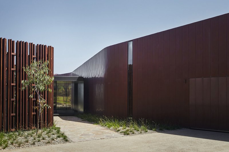 Загородная вилла по проекту Джона Уордла построена на холмистом полуострове Морнингтон в Австралии. Она больше напоминает музыкальный инструмент или модернистскую скульптуру, чем дом. Известный выразительными постройками, которые точно соответствуют топографии места, Джон Уордл основал свою фирму John Wardle Architects в 1986 году. Этот загородный дом под названием Boneo Country House, построенный в 2013-2017 годах, завоевал сразу несколько архитектурных премий, в т.ч. Award for Interior Architecture, Award for Residential Architecture, AIA Victoria 2018 и Habitus House of the Year 2018. Этот современный дом площадью около 400 кв. метров с четырьмя спальнями позволяет владельцам и их четырем взрослым детям жить независимо, но время от времени объединяться в одну семью. Автор описывает его как «капризный объект с живым интерьером». Обшитый медью объем на первый взгляд скрывает входы и только через какое-то время понятно как с ним взаимодействовать. Его ядро — старая ферма, викторианский деревенский дом с одной спальней, типичный для этой местности. Старое и новое собрались вместе ради впечатления, основанного на потрясающих видах. Чтобы достичь нужного эффекта, Уордл снес треть существующих построек в фермерском комплексе, которому было 15 лет, и добавил медное крыло на месте сарая, модернизировав оставшиеся части. Главная точка, от которой строится планировка Boneo Country House — это кухня. Здесь есть массивный очаг (плита Aga) и системы стеллажей из латуни. Узорные плитки ручной работы были выбраны архитекторами, которым важно было подчеркнуть technocraft и показать живые следы ручного труда. «Вы обнаружите, что стены различаются по толщине, до метра в глубину, чтобы вместить предметы», — говорит Джон, который сотрудничал с дизайнером Эндрю Лоу, для создании большого деревянного обеденного стола. Внутренняя часть нового крыла облицована древесиной местных пород Pinus Macrocarpa с фактурным и многослойным эффектом. Она обволакивает стены, полы и поверхности своим теплом. Раздвижная дверь ведет на террасу из столовой, в которой находится винный бар. Уордл описывает соединение интерьера с ландшафтом как процесс «картирования». В Boneo Country House он «поделил панораму» на виды на залив Порт-Филлип и пролив Басса, опуская потолки в сторону проемов для усиления эффекта.