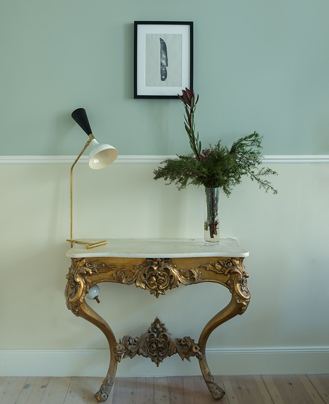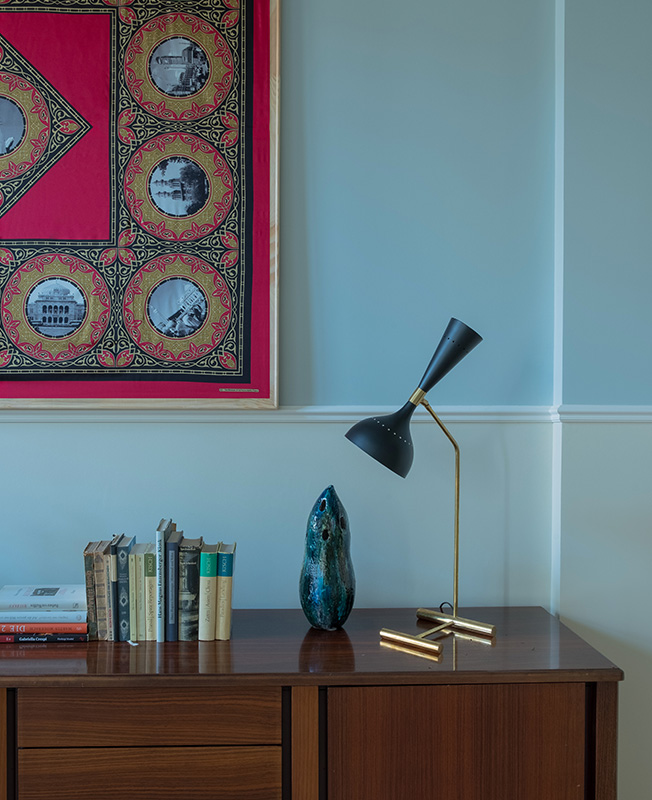 Изысканная композиция: над консолью XIX века — литография бразильского художника Паулу Назарета. Настольная лампа: Италия, 1950.