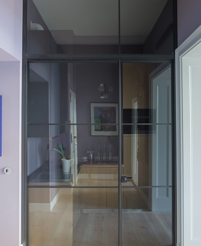 Вид из гостиной в прихожую и спальню — квартира выходит на обе стороны и просматривается насквозь. Дизайнер сохранил историческую планировку. На стене работа Олега Назарова.