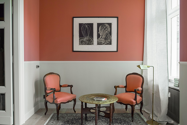 Итальянские кресла 1950-х выполнены в стиле Людовика XV. Их обивки гармонируют с оттенком стен. Как и во всей квартире, здесь использована краска Farrow&Ball. Столик привезен из Марокко.
