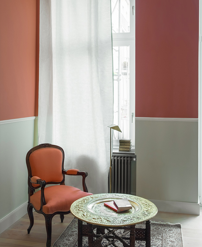 Дизайнер не мог предвидеть, что оттенок, который он выбрал для спальни, станет цветом 2019 г. по версии Pantone. Как и во всей квартире, здесь использована краска Farrow&Ball. Итальянские кресла, 1950. Столик привезен из Марокко.