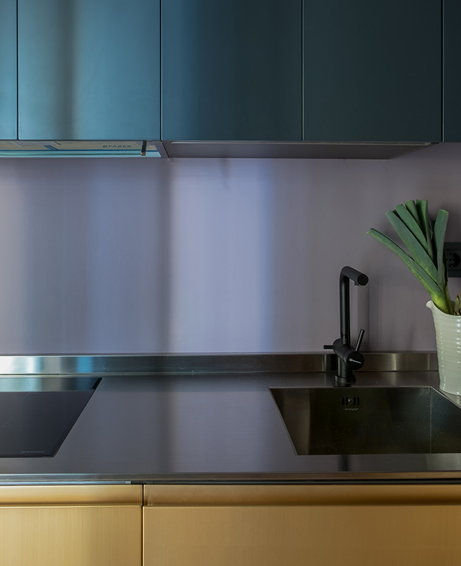 Для стен кухни Павел Воловов выбрал тот же оттенок, что и в прихожей — это визуально объединяет помещения. Кухонная мебель Linea Quattro — нижние фасады выкрашены лаком оттенка латуни.