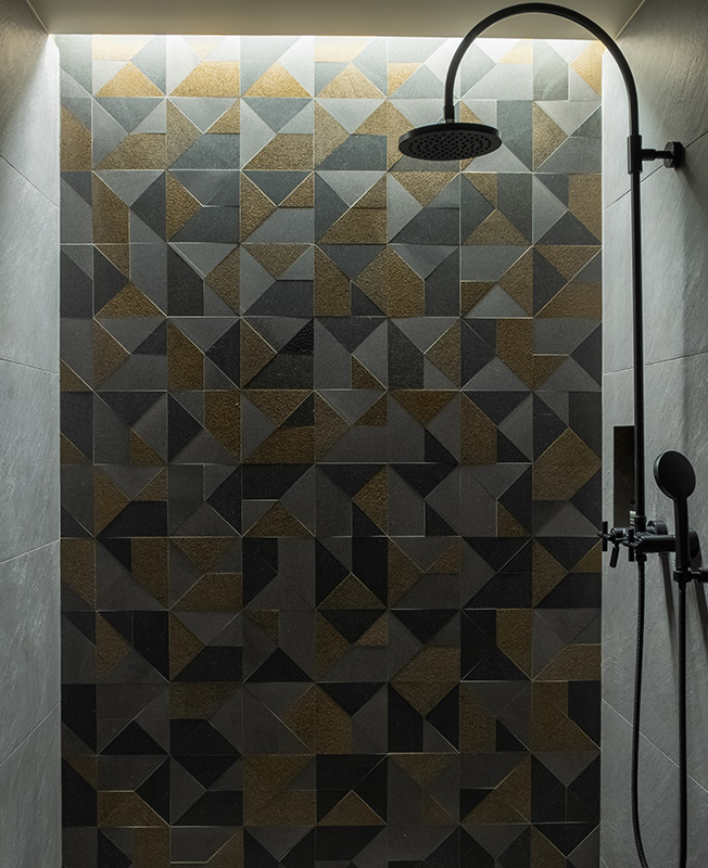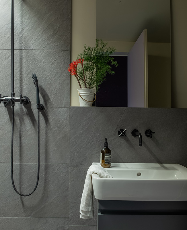 Ванная отделана лавовым камнем Nero Sicilia. Смесители Dornbracht.