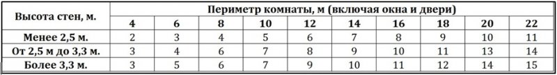 Так же для расчета количества рулонов можно использовать периметр комнаты, и воспользоваться следующей таблицей.