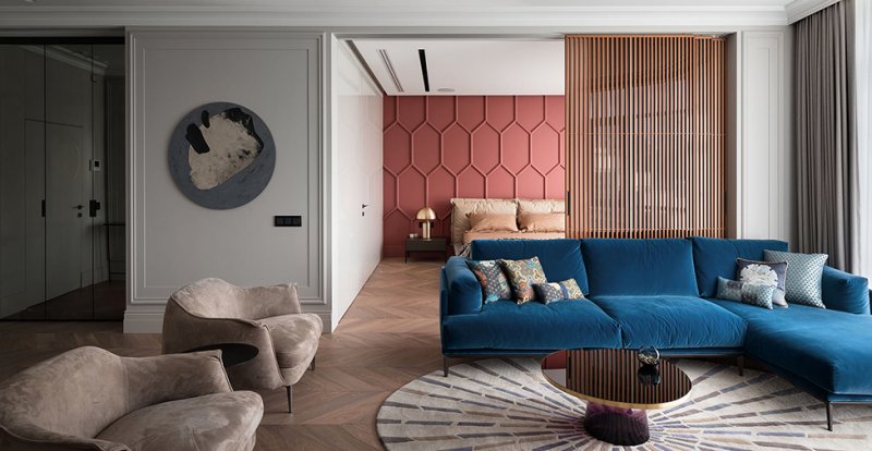 Спальня символически отделена от гостиной сдвижной перегородкой — она пропускает свет, не перекрывает полностью видимость и не превращается в глухую стену, но делает пространство более уютным и инимным.
