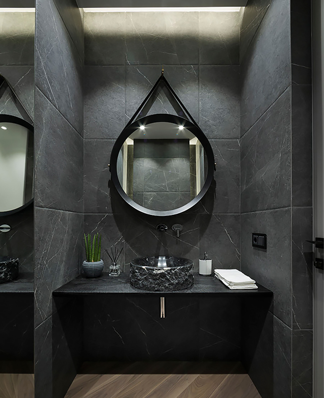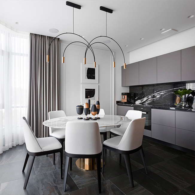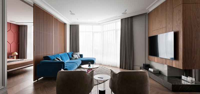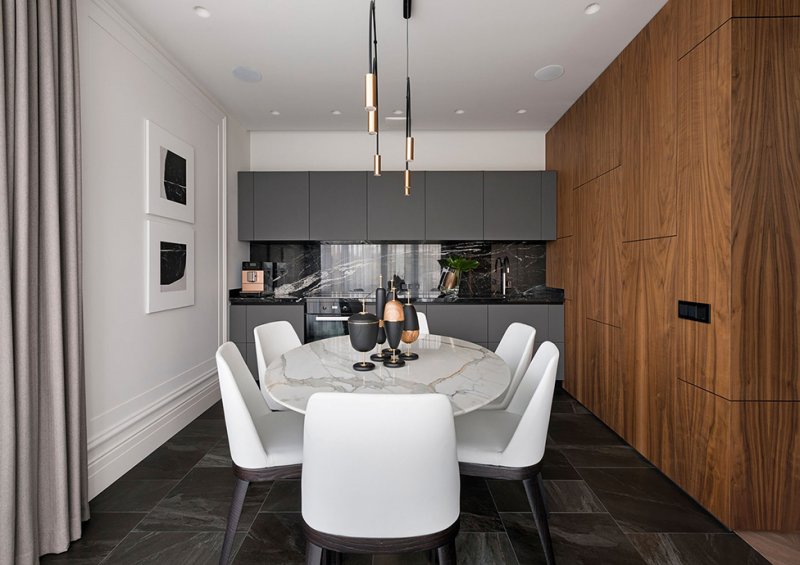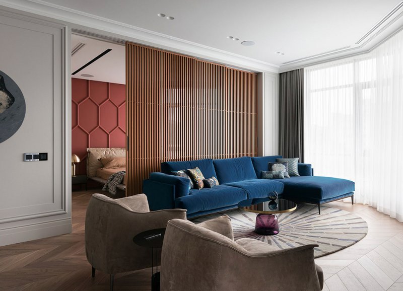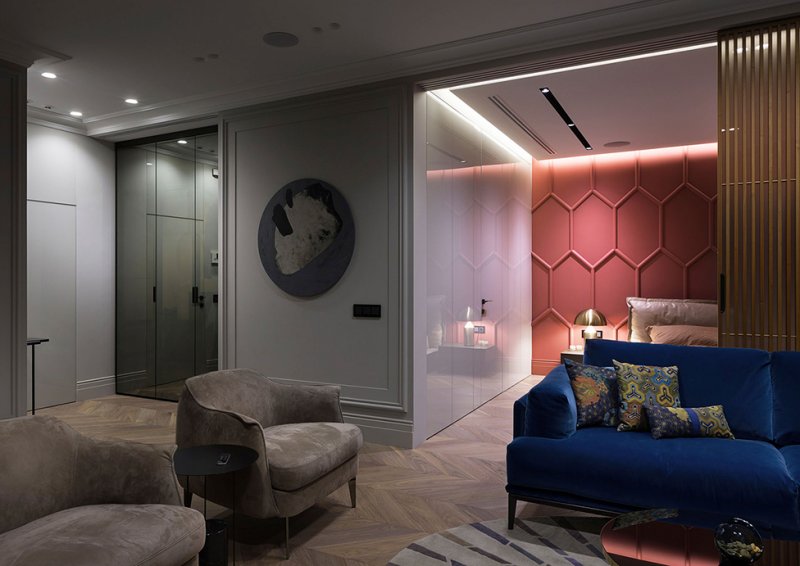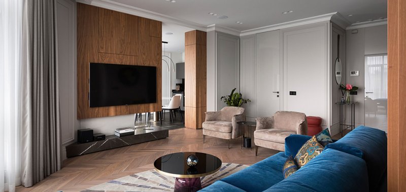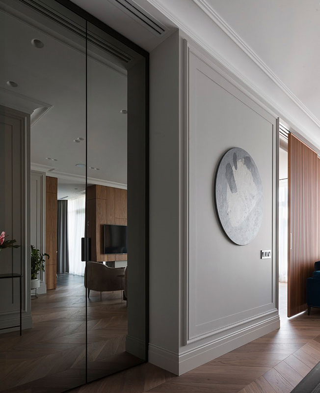 Архитекторы Андрей Медведь и Игорь Фоменко, бюро OM-Architecture, оформили интерьер квартиры в Киеве. Яркой, характерной деталью всего проекта стала стена в зоне спальни. Заказчики, семейная пара, хотели получить свободное, комфортное пространство. На площади 80 кв. метров архитекторы разместили все необходимые зоны — гостиную, спальню, кухню, столовую и два санузла. Двери имеют только хозяйская ванная комната и гостевой санузел. Остальные пространства плавно перетекают друг в друга, создавая ощущение большего простора. Спальня символически отделена от гостиной сдвижной перегородкой — она пропускает свет, не перекрывает полностью видимость и не превращается в глухую стену, но делает пространство более уютным и инимным. В спальне же расположено и самое яркое цветовое пятно всего интерьера — стену за изголовьем, выкрашенную в насыщенный оттенок, украшает рельефный узор. Он перекликается с классическими гипсовыми молдингами на других стенах — как и нейтральная палитра в остальных зонах квартиры, они отсылают к парижским интерьерам в османовских домах. Чтобы визуально не загоромождать пространство и с толком задействовать нестандартную планировку, в проекте использовали мебель, созданную на заказ по чертежам архитекторов. Так, специально для этого интерьера были изготовлены кухонный гарнитур, блок над камином и стеновые панели со скрытыми системами хранения. Материалы выбрали благородные, вне времени — использовали древесину, мрамор, кожу, латунь и стекло. nonehttps://www.instagram.com/om.architecture/https://www.facebook.com/om.architecture.ua/https://www.om-architecture.com/ nonehttps://www.instagram.com/om.architecture/https://www.facebook.com/om.architecture.ua/https://www.om-architecture.com/