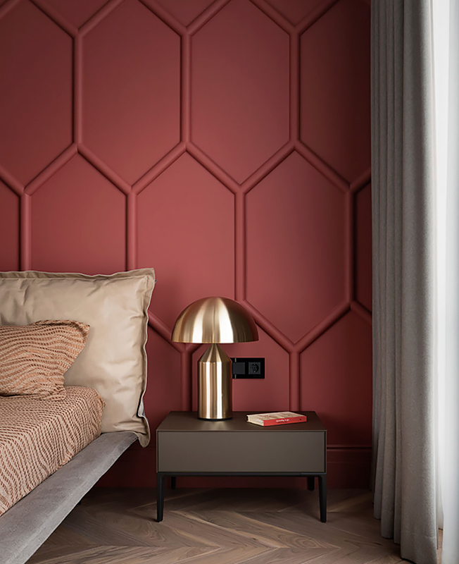 В спальне же расположено и самое яркое цветовое пятно всего интерьера — стену за изголовьем, выкрашенную в насыщенный оттенок, украшает рельефный узор. Он перекликается с классическими гипсовыми молдингами на других стенах — как и нейтральная палитра в остальных зонах квартиры, они отсылают к парижским интерьерам в османовских домах.