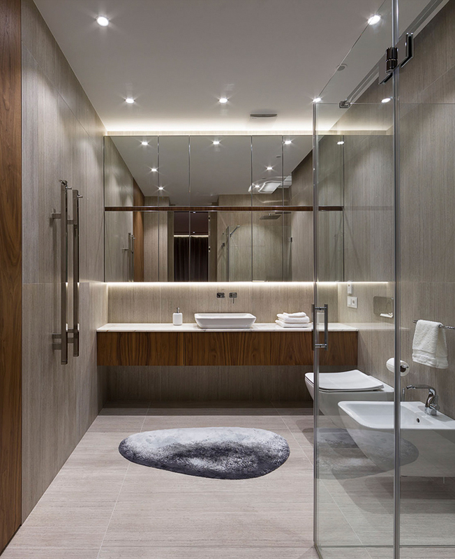 Заказчики, семейная пара, хотели получить свободное, комфортное пространство. На площади 80 кв. метров архитекторы разместили все необходимые зоны — гостиную, спальню, кухню, столовую и два санузла. Двери имеют только хозяйская ванная комната и гостевой санузел. Остальные пространства плавно перетекают друг в друга, создавая ощущение большего простора.