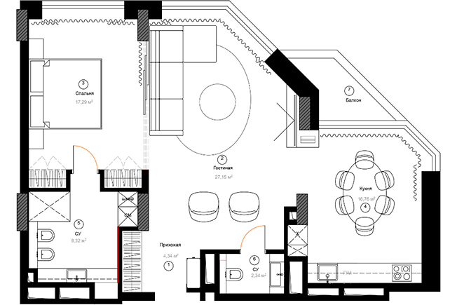 Чтобы визуально не загоромождать пространство и с толком задействовать нестандартную планировку, в проекте использовали мебель, созданную на заказ по чертежам архитекторов.
