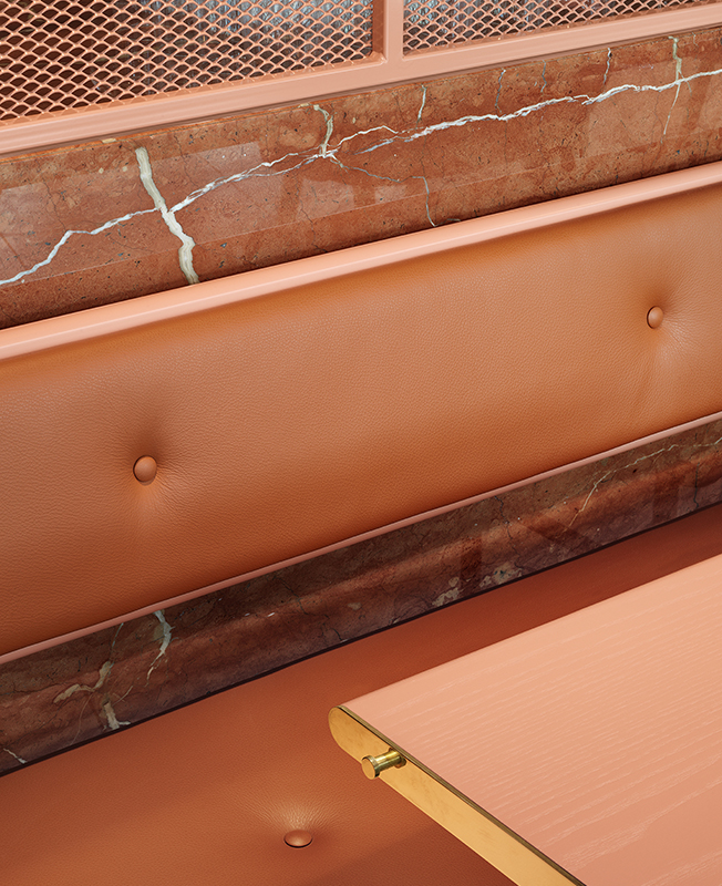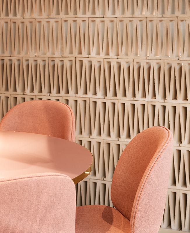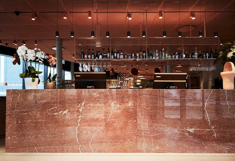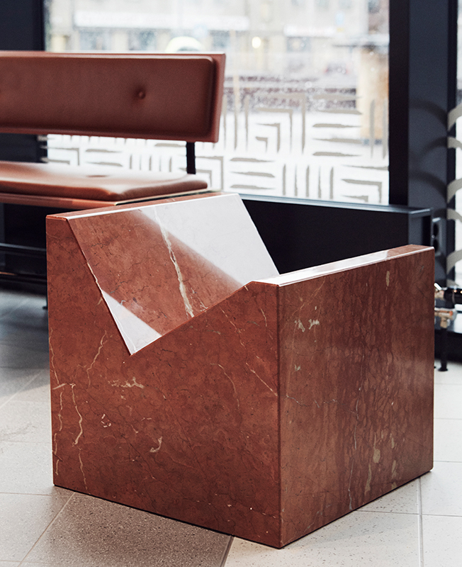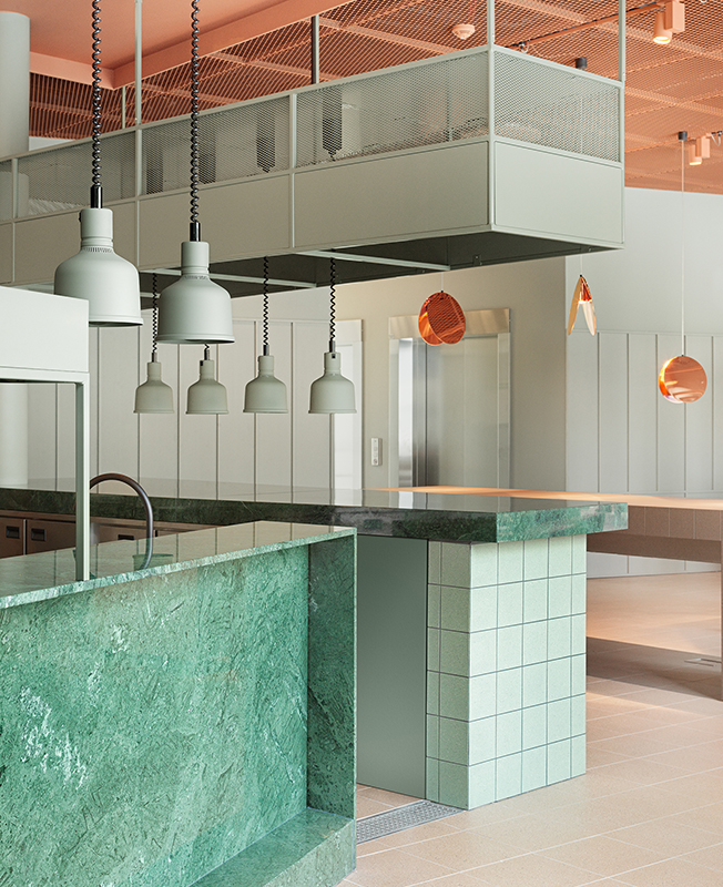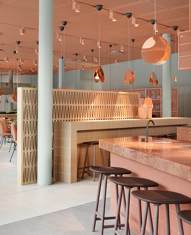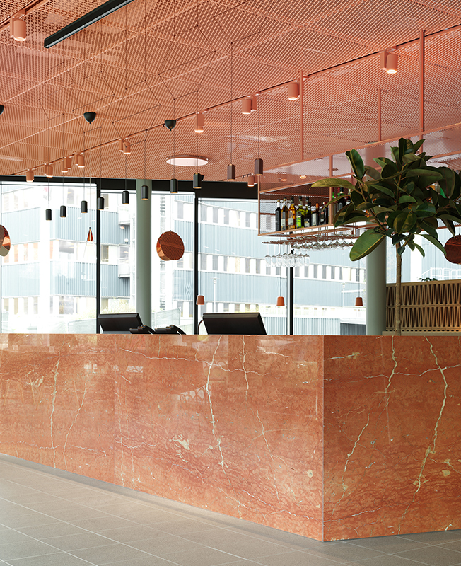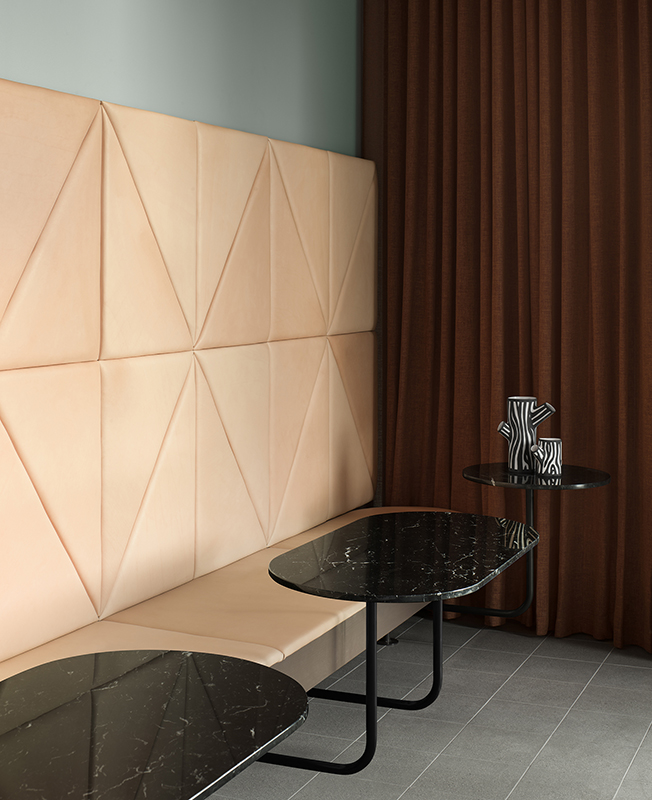 Общественные пространства — лобби, лаундж-зона, бар и ресторан Norobata — задуманы Note Design Studio как «уютная гостиная». Интерьер построен на комбинации приятных на ощупь устойчивых материалов и спокойной «ободряющей» палитры. Разделительная стена в баре — терракотовая коллекция Celosia по дизайну Патрисии Уркиолы для Mutina.