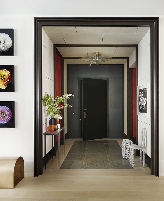 Лофт Tribeca по проекту студии Grade в Нью-Йорке. Вход в холл из лифта. Здесь авторы представили основные материалы проекта: темный тонированный дуб, патинированная бронза. Обои, Donghia. Консоль, Holly Hunt. Люстра, Jason Koharik. Бронзовая скамья, диз. Кристофер Стюарт.