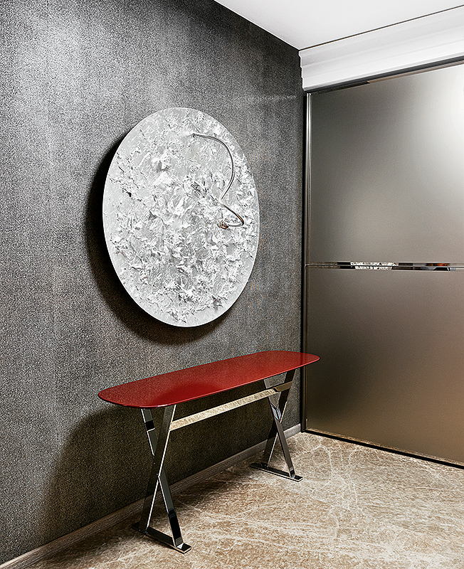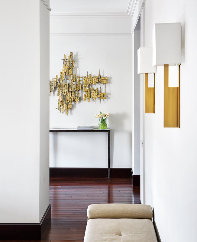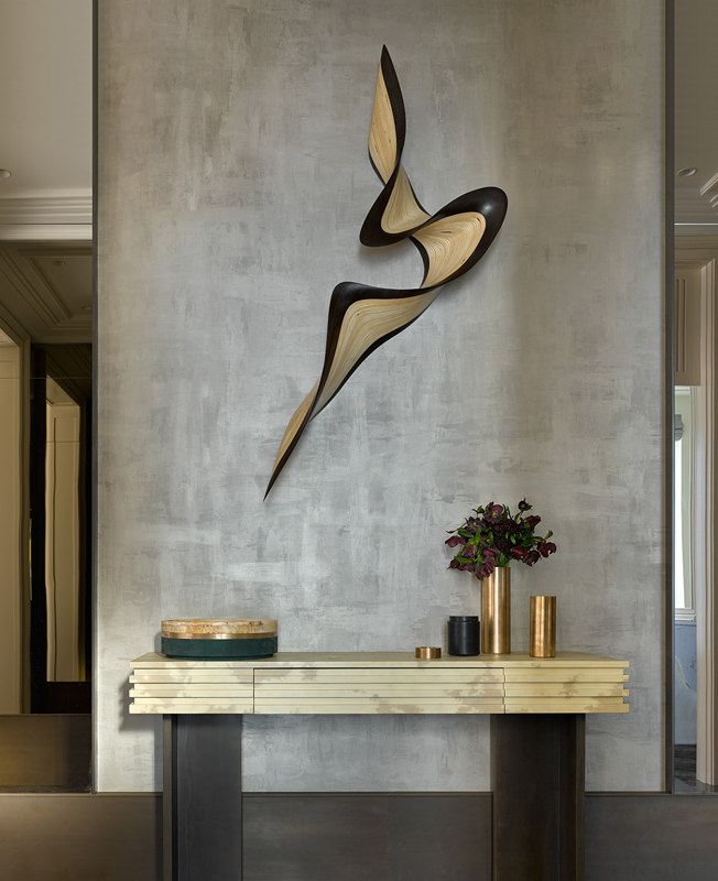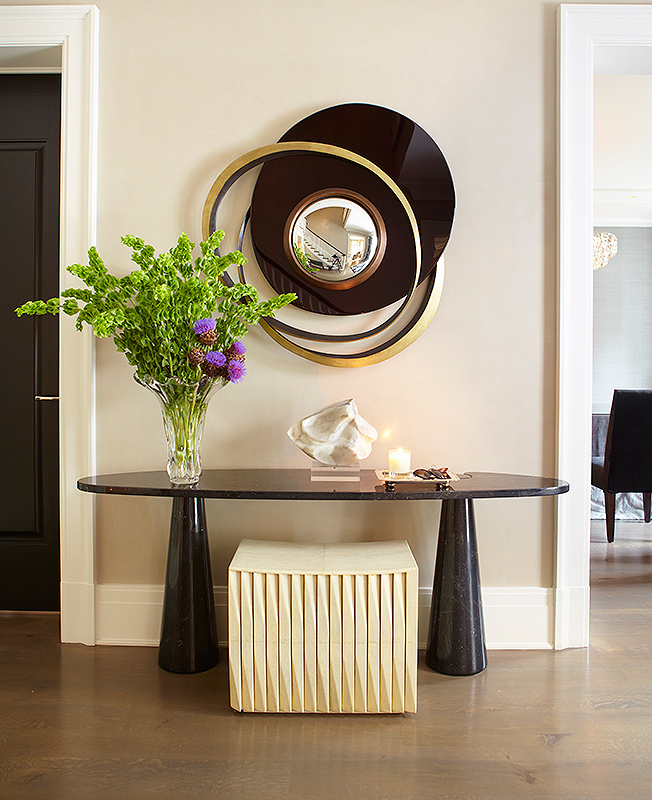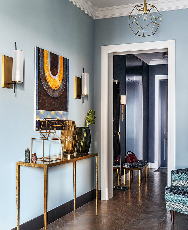 Квартира в Хамовниках — проект студии Porte Rouge. От входа открывается изысканная композиция: консоль и бра Holly Hunt, панно из латуни (Artisan).