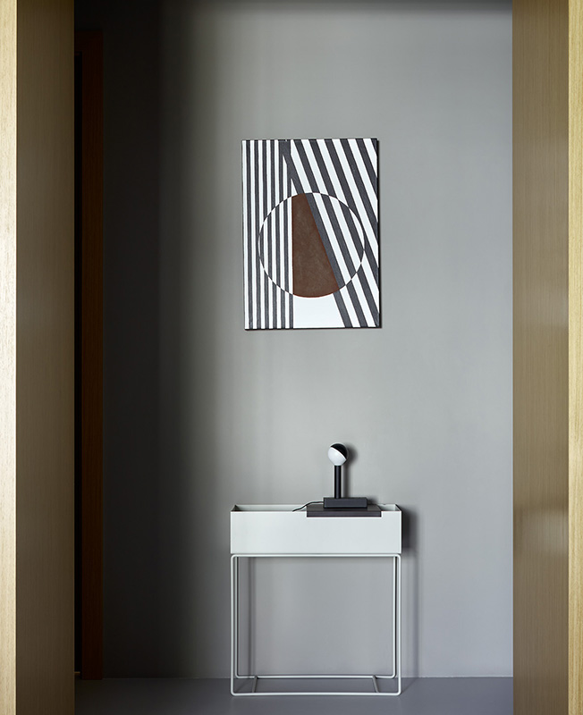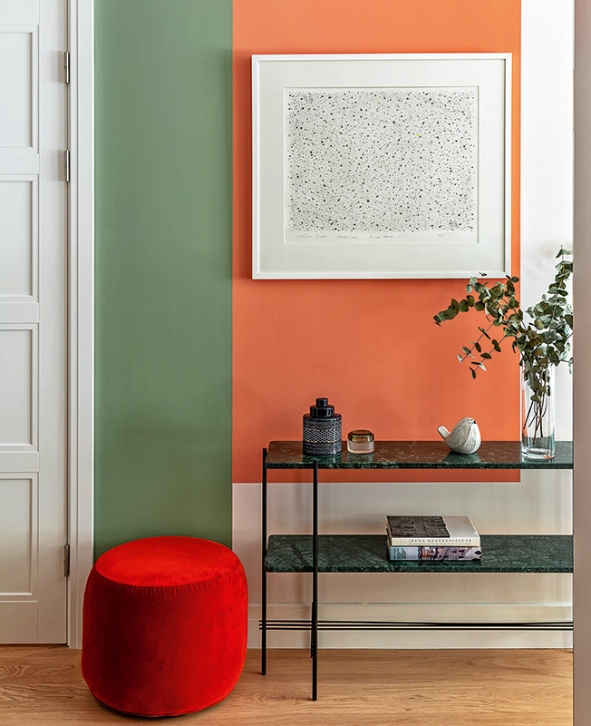 Эклектичная квартира в центре Риги по проекту Agnes Rudzite Interiors. Прихожая. «Космос» — литография Зане Балодэ. Консоль, Gubi.