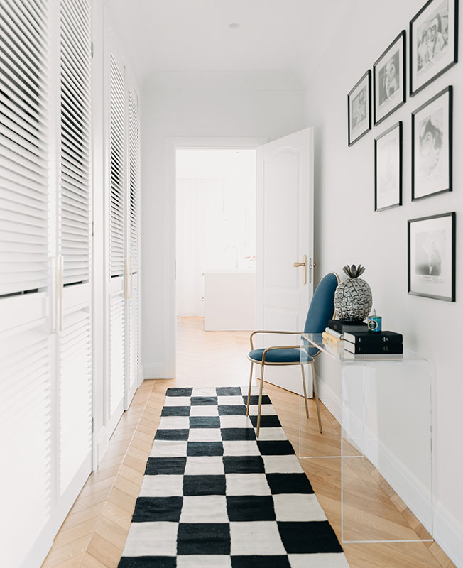 Проект Агнес Рудзите — квартира в центре Риги. Отправной точкой стала актуальная стилистика mid-century modern. Прихожая. Черно-белая графика всегда выглядит благородно. Стул с подлокотниками, Se.