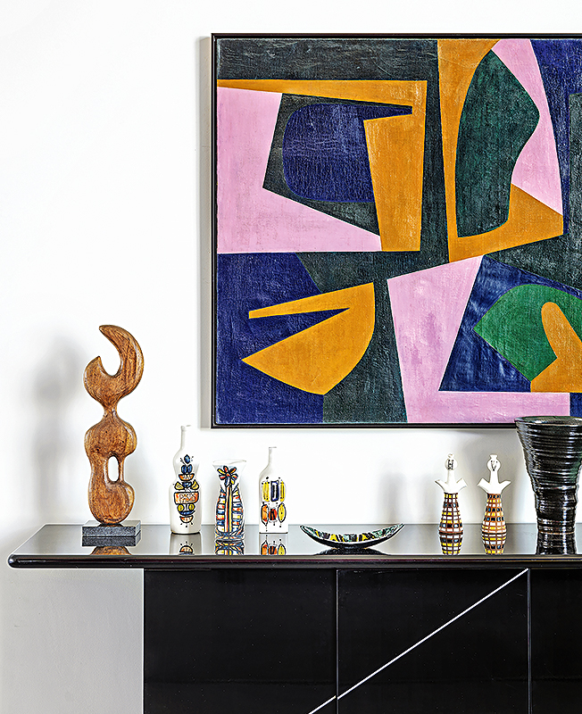 Апартаменты 500 кв. метров для своей семьи в Бейруте по дизайну Нэнси Гэбриэл и Грегори Гатсерелиа. Консоль из лакированного дерева, диз. П. Карден, 1970. Картина ливанского художника С. Рауда Шукера. Расписная керамика, Р. Капрон, 1950. Чаша, Л. Горка. Справа черная ваза ливанского керамиста Р. Навама.