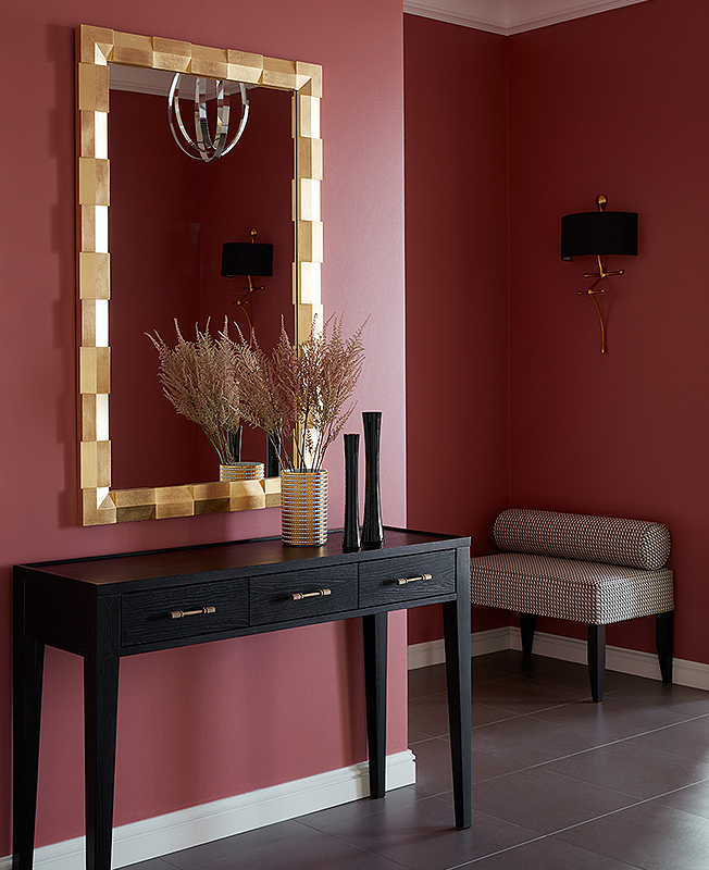 Дина Салахова (BespaceStudio) создала спокойный, комфортный для жизни, вневременной интерьер в новостройке в Филях. Для стен холла выбрали насыщенный бордовый тон, который поддерживает цвет дивана в гостиной. Пуф выполнен на заказ в ткани Hermes. Зеркало, Porta Romana. Бра, Arteriors.