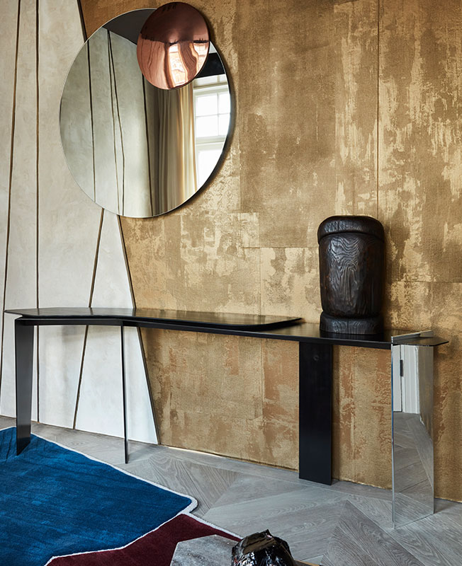 Дизайнерский дебют известного режиссера и сценариста Луки Гуаданьино: бывшая шелкопрядильня на берегу озера Комо. Входной холл. Зеркало и консоль, диз. Клод Лаланн.