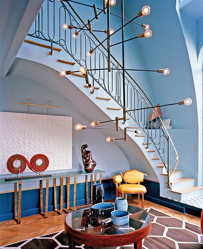 Итальянцы в Париже: квартира Бритта Морана и Эмильяно Сальчи. Лестница с металлическим ограждением ведет в мезонин. Вертикаль поддержана светильником, спроектированным Dimore Studio. У стены — их же консоль, желтое кресло, диз. М. Гампер, и работа Э. Кастеллани.