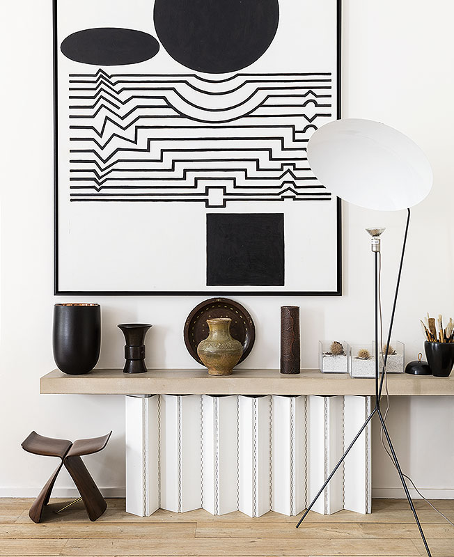 Фрагмент в интерьере дизайнера Дидье Гомеза. На стене работа Mindanao, В. Вазарели, 1967. Слева табурет Butterfly, диз. С. Янаги. Справа торшер Solveig, диз. A. дe Пастр для Cinna. На консоли китайские и японские вазы XVII–XVIII вв.